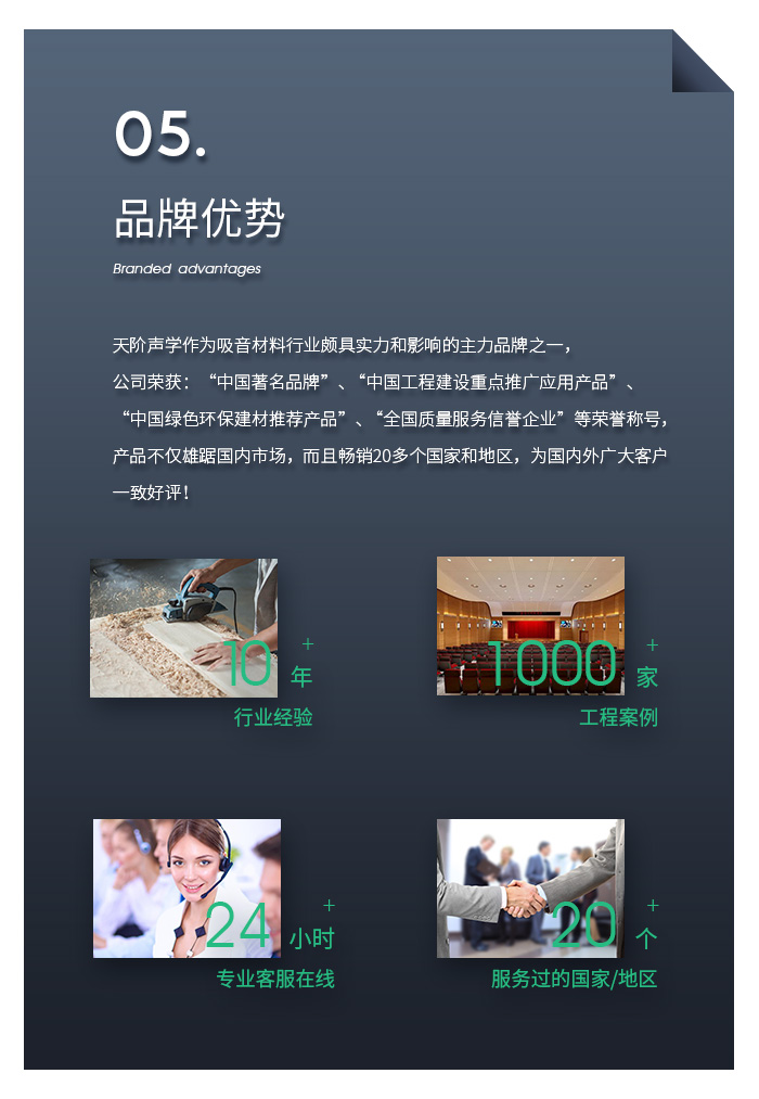 佛山市南海天階聲學(xué)材料廠作為當(dāng)今中國(guó)吸音材料行業(yè)具有實(shí)力和影響的主力品牌之一,公司榮獲:中國(guó)著名品牌、中國(guó)工程建設(shè)重點(diǎn)推廣應(yīng)用產(chǎn)品、中國(guó)綠色環(huán)保建材推薦產(chǎn)品、全國(guó)質(zhì)量服務(wù)信譽(yù)企業(yè)、等榮譽(yù)稱號(hào),產(chǎn)品不僅雄踞國(guó)內(nèi)市場(chǎng),而且暢銷多個(gè)國(guó)家和地區(qū),為國(guó)內(nèi)外廣大客戶一致好評(píng)!