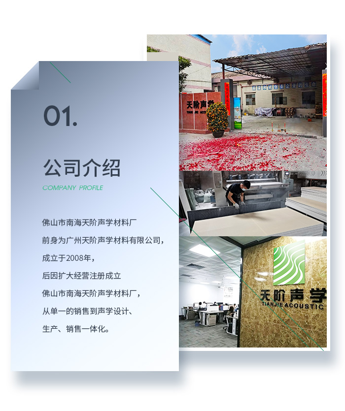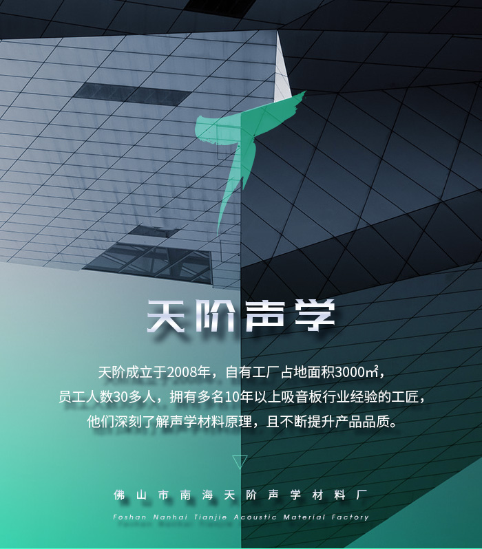 佛山市南海天階聲學(xué)材料廠前身為廣州天階聲學(xué)材料有限公司,成立于2008年,后因擴(kuò)大經(jīng)營(yíng)注冊(cè)成立佛山市南海天階聲學(xué)材料廠,工廠占地3000多平米,從單一的生產(chǎn)銷售到:聲學(xué)設(shè)計(jì)-生產(chǎn)-銷售-聲學(xué)工程施工一體化,是一家專業(yè)的聲學(xué)環(huán)境解決方案綜合服務(wù)商。