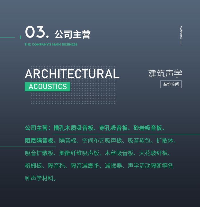 公司主營(yíng):槽孔木質(zhì)吸音板、陶鋁吸音板、砂巖吸音板、布藝吸聲板、吸音軟包、微孔吸音板、碳塑吸音板、聚酯纖維吸聲板、隔音板、隔音氈、隔音減震墊、減振器,干掛板與聲學(xué)活動(dòng)隔斷、固定高隔間等各種聲學(xué)材料。