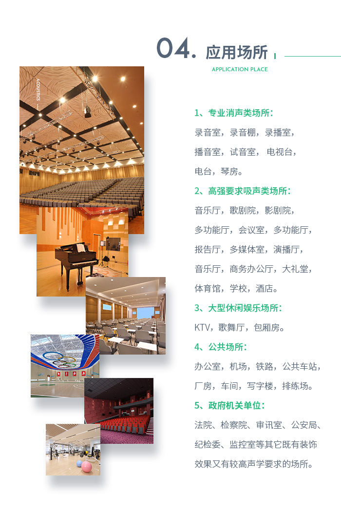 2、高強(qiáng)要求吸聲類場(chǎng)所:歌劇院,影劇院,多功能廳,會(huì)議室,多功能廳,報(bào)告廳,多媒體室,演播廳,音樂(lè)廳,商務(wù)辦公廳,大禮堂,體育館,學(xué)校,酒店。