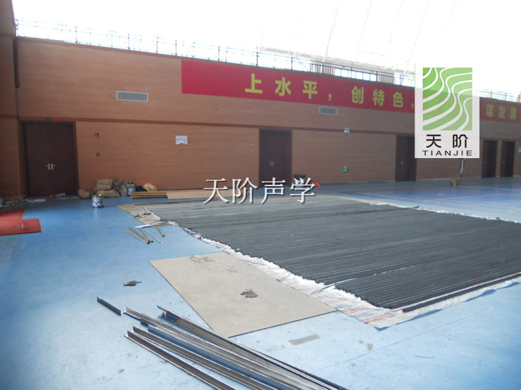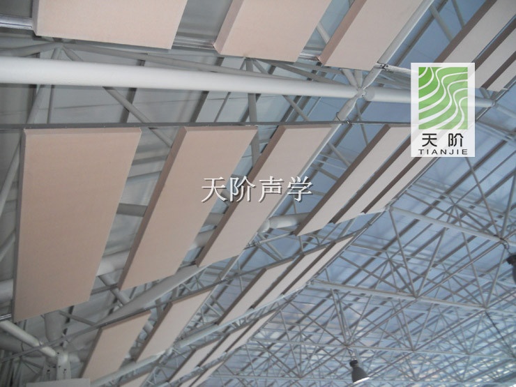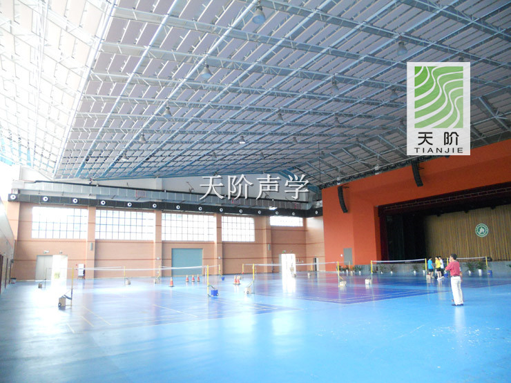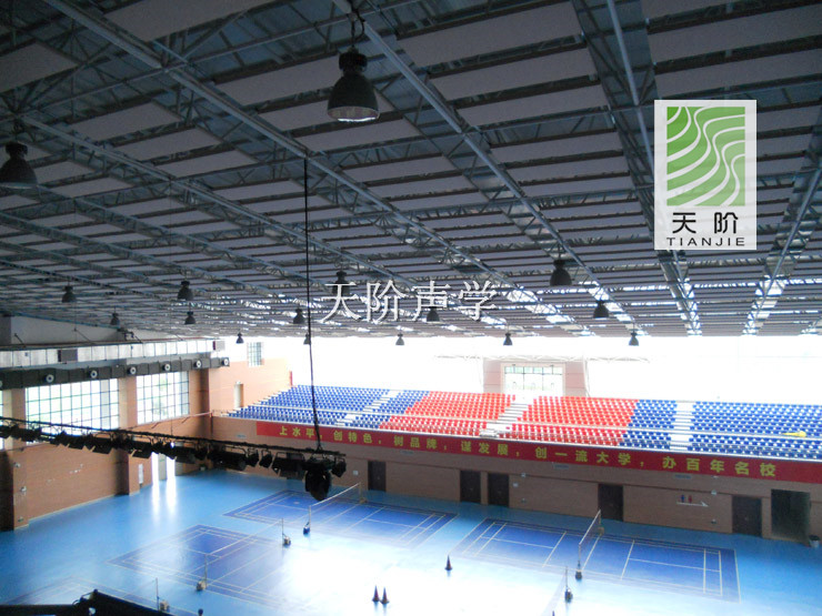 同時體育館頂棚也裝有具高效天階平板吸收性能的空間吸聲體。天階平板空間吸聲體是由優(yōu)質玻璃纖維棉、定制鋁質邊框、吸音防塵玻纖布組成。它是其他聲學材料吸聲行能的2倍。從而大大減少了體育館的回聲。