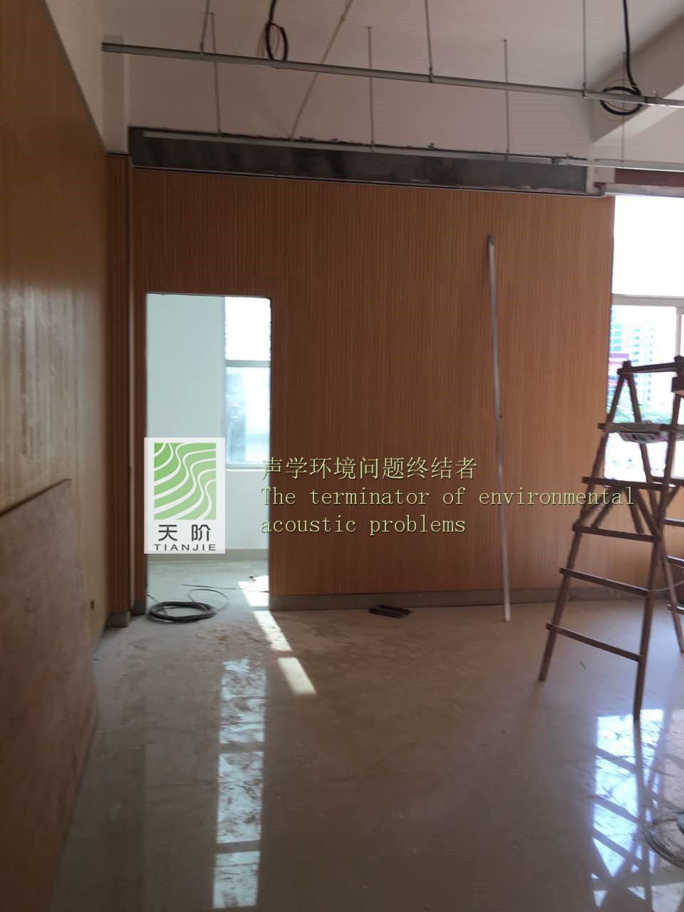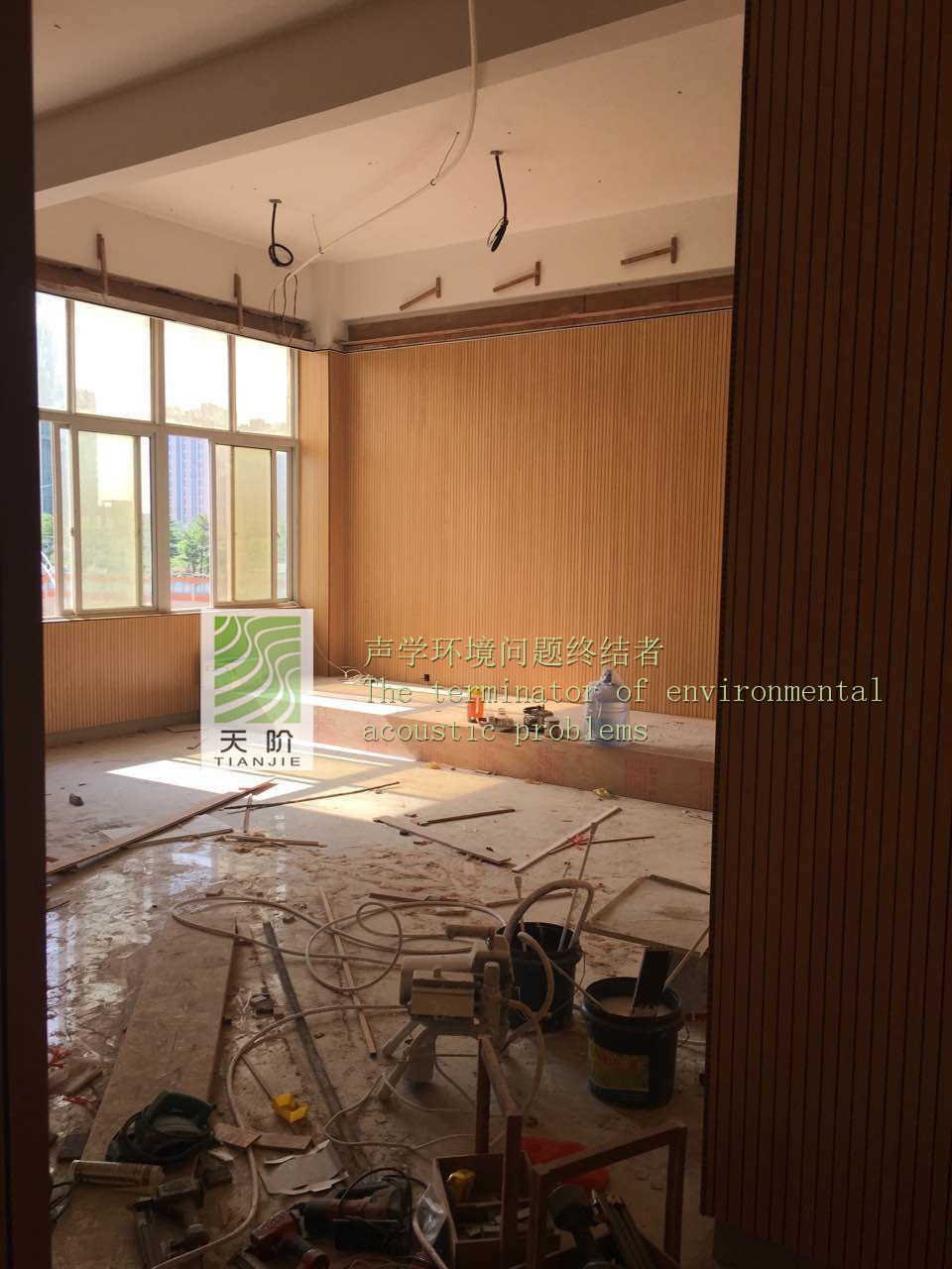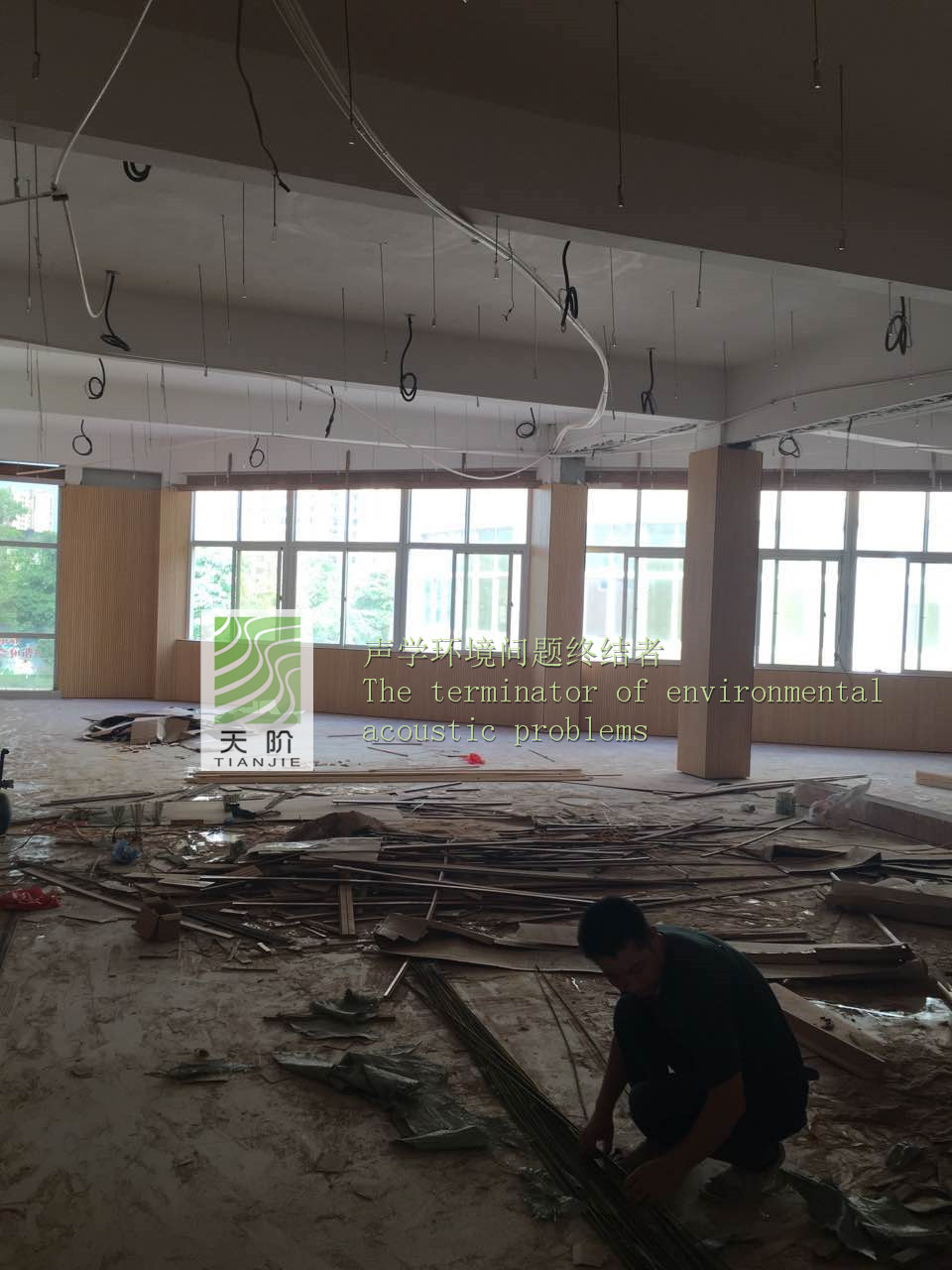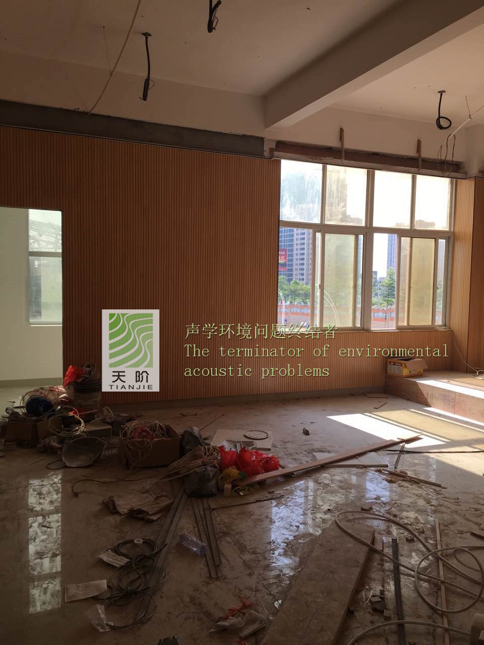 福建省泉州市惠安縣政府對青少年宮非常的重視,特地邀請了專家對舞蹈室、鋼琴室、教室進行了吸音設計。教室的聲學設計應以語言清晰度為主,教室的混響時間長短、背景噪聲、響度對語言清晰度影響最大。不同大小的教室,對混響時間長短的要求會有所不同。教學場所要求較高的語言清晰度,需要較短的混響時間,可以通過室內選用合理的吸音材料和現場裝修布置達到。室內墻面是聲學裝修時面積最大可供利用的表面,所以決定在四周的墻面上安裝槽木吸音板,此時使用了我們天階牌的槽木吸音板共2000平方。