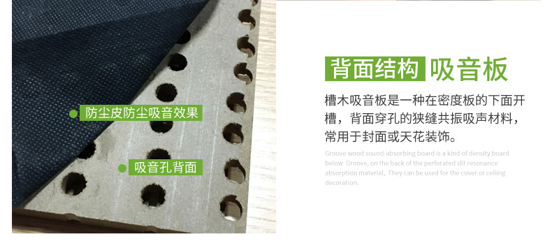 穿孔木質(zhì)吸音板是一種在密度板上直接穿孔的共振吸聲材料。穿孔木質(zhì)吸音板對吸聲頻譜選擇性很強,對中低頻有很好的吸音性能。如在吸聲結(jié)構(gòu)后空腔上填入適量的吸聲棉可提高中、高頻的吸聲效果。