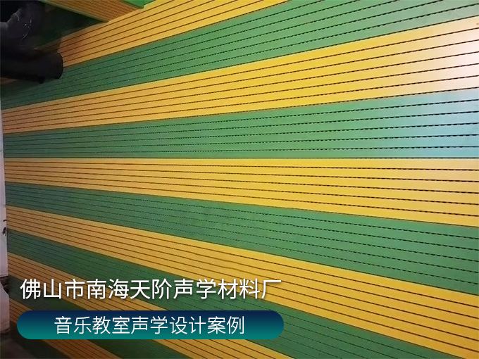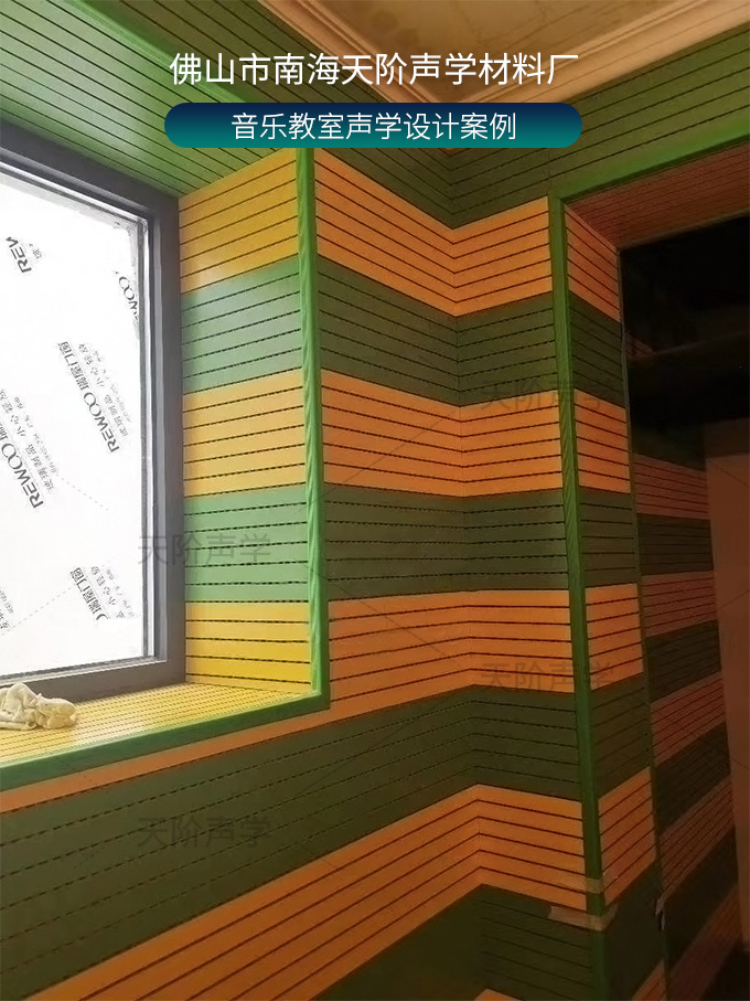 音樂(lè)教室聲學(xué)設(shè)計(jì)案例 ,墻面使用條形槽木吸音板,鮮艷的三聚氰胺飾面,青春活力,降噪又美觀。