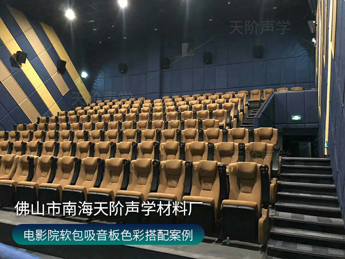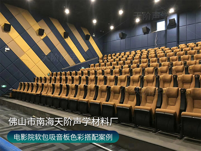 活力亮眼的黃色+灰色調電影院,墻面選用有防撞效果的軟包吸音板,拼色安裝設計,做不燃處理,舒適又安心,吸收噪音雜音很有效果。