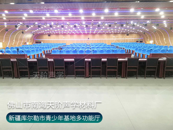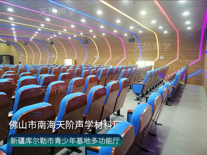 新疆庫爾勒市青少年基地智慧多功能廳項(xiàng)目,天花板和墻面都選用槽木吸音板,基材采用不燃玻鎂基材,安心安心。