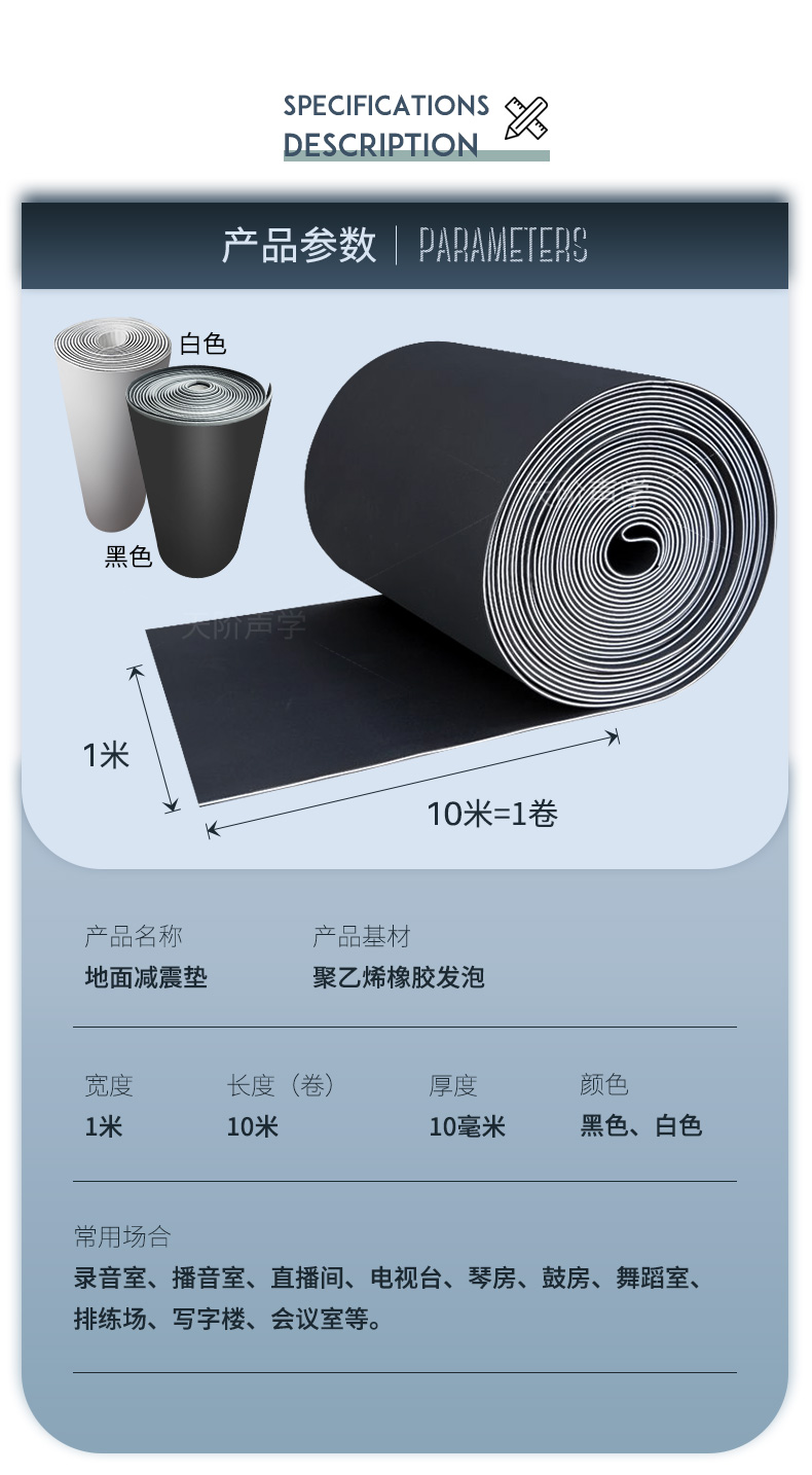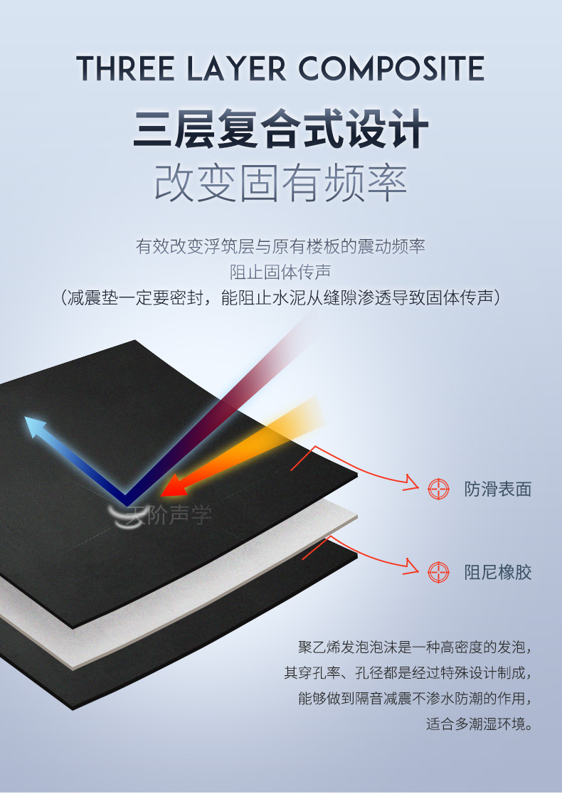 減振墊主要應(yīng)用于KTV、酒吧、健身房、住宅、賓館、酒店、學(xué)校、商務(wù)大廈;KTV、夜總歌舞廳等娛樂場所及其它需要隔音減振的地方,具有的阻尼減振效果,是一種性價(jià)比高的輔助地板材料。