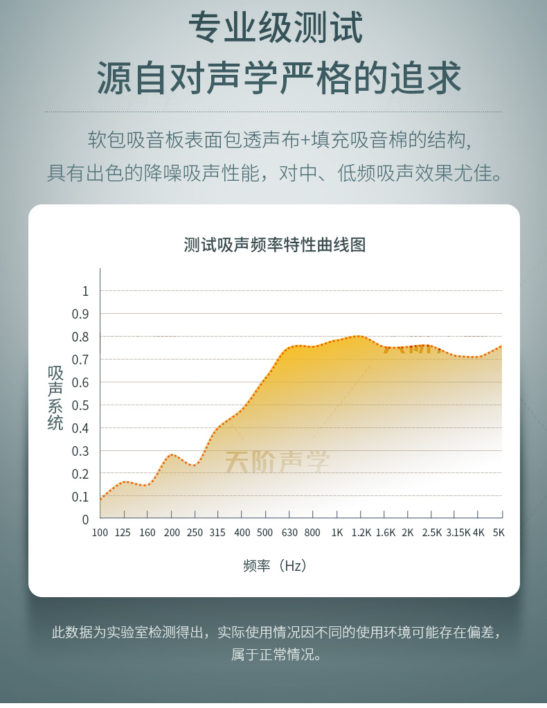 天階聲學布藝吸聲板采用高質的96kg/m3玻璃吸音棉。具有環保、阻燃、吸聲頻帶寬、裝飾性強、施工簡單、無粉塵污染等性能,飾面顏色及材料選擇性廣,能很好地滿足客戶多樣化的聲學及裝飾需求。