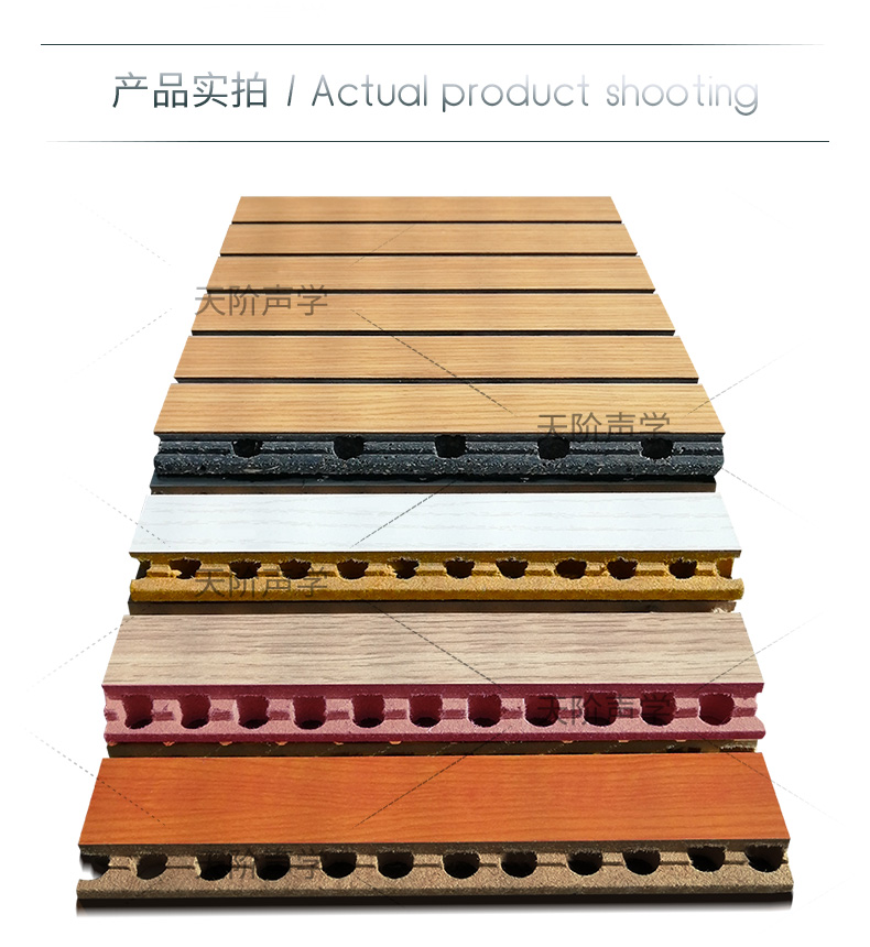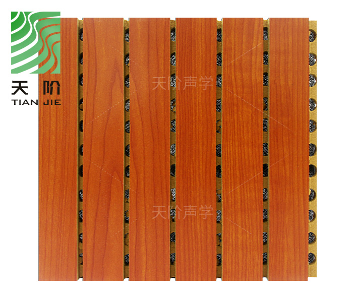 天階聲學材料廠生產的此種天階槽木吸音板由一系列彼此等槽距條組成,通過對槽背面孔徑的大小,深淺,正面槽的寬度,深度以及穿孔率進行嚴格的核算,從而在不同的頻率上取得理想的吸聲效果,有效控制聲波的反射和擴散,消散雜波和噪音,令室骨有合理的混響時間,達到締造音質的吸音效果。