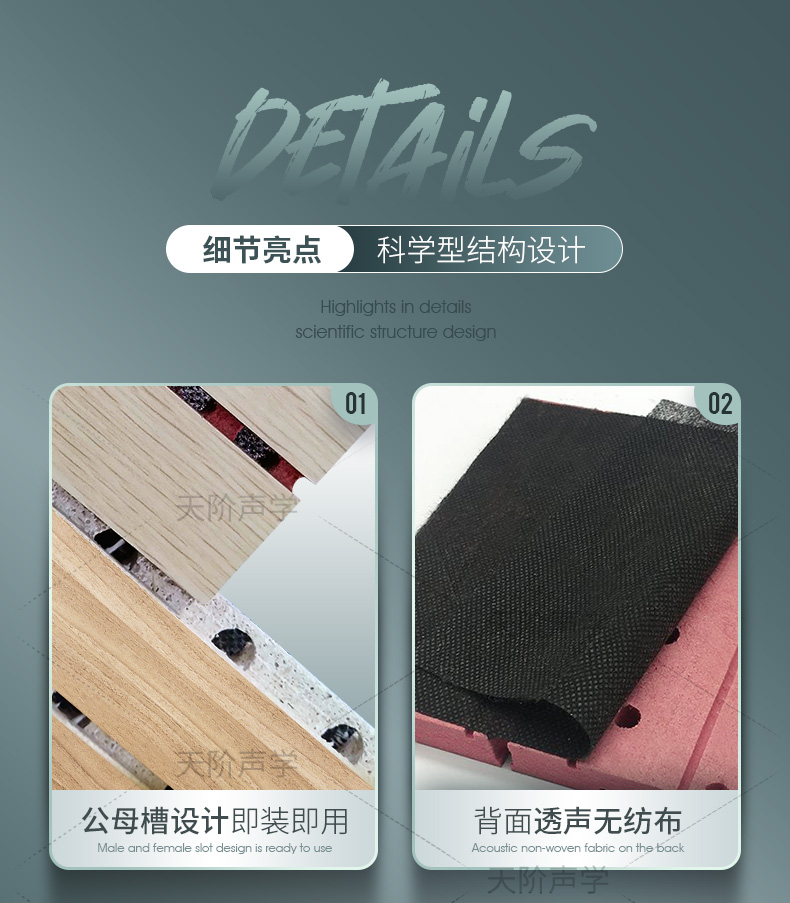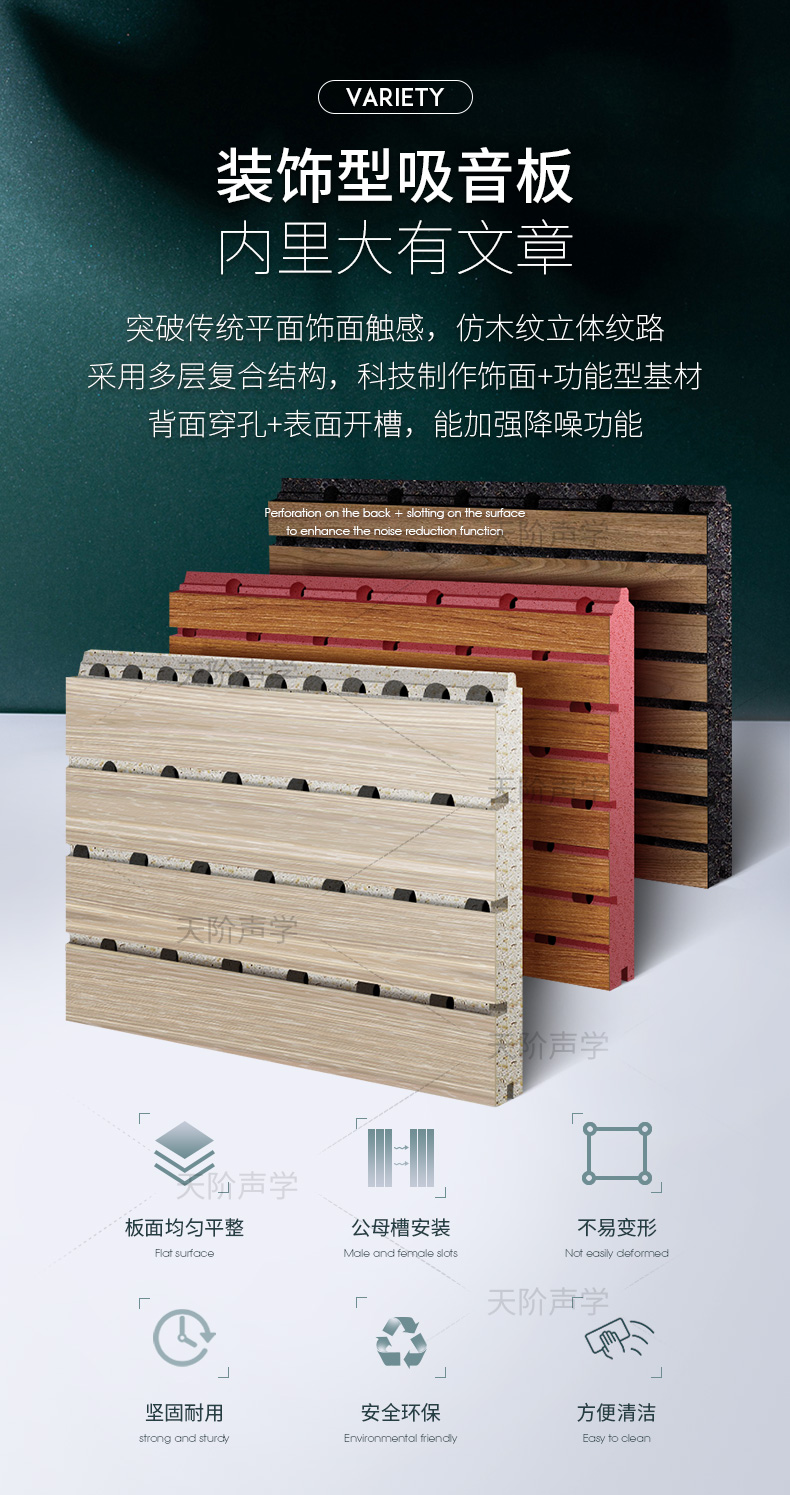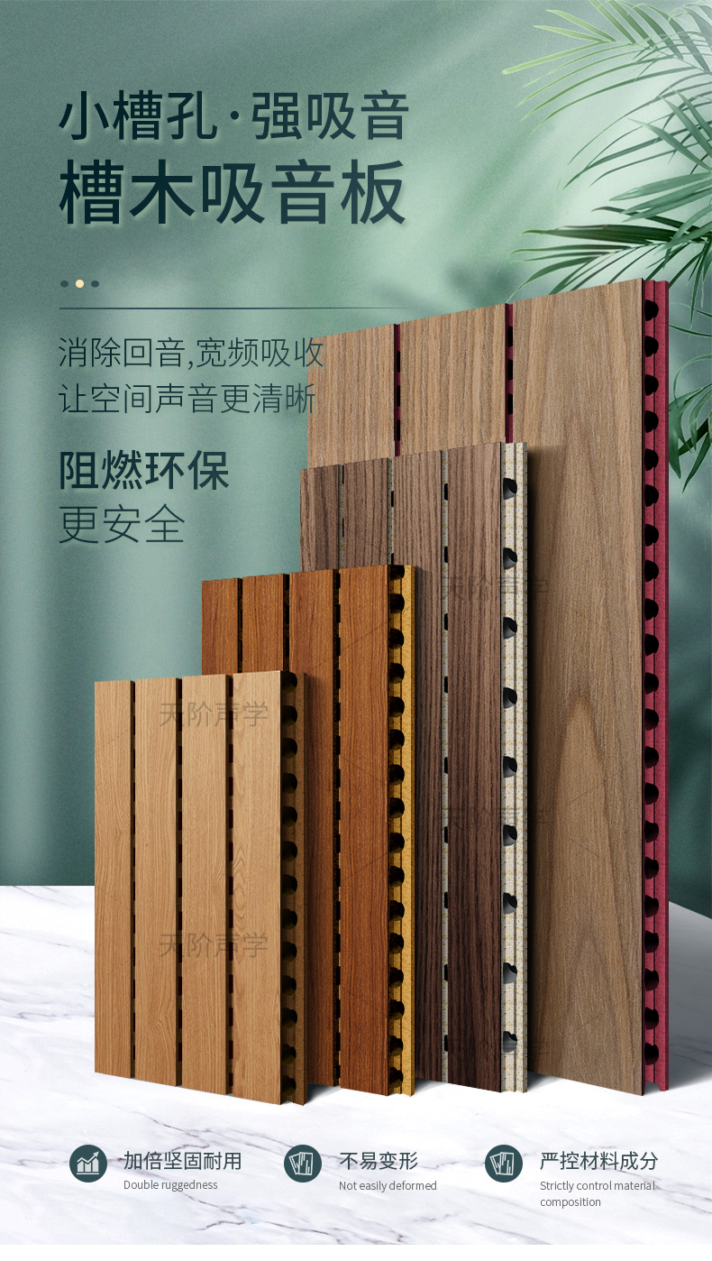 3、環保產品――所有材料符合國家環保標準,甲醛含量極低,公司還可根據客戶需要訂做E0級零甲醛實木吸聲板。
