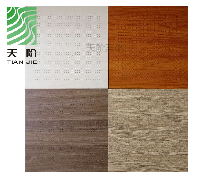 孔木吸音板是一種在密度板上直接穿孔的共振吸聲材料。孔木吸音板對(duì)吸聲頻譜選擇性較強(qiáng),對(duì)低頻有很好的吸聲性能。如在吸聲結(jié)構(gòu)后空腔上填入適量的吸聲棉可提高中、高頻吸聲效果。