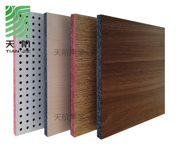 孔木吸音板是一種在密度板上直接穿孔的共振吸聲材料。孔木吸音板對吸聲頻譜選擇性較強,對低頻有很好的吸聲性能。如在吸聲結構后空腔上填入適量的吸聲棉可提高中、高頻吸聲效果。