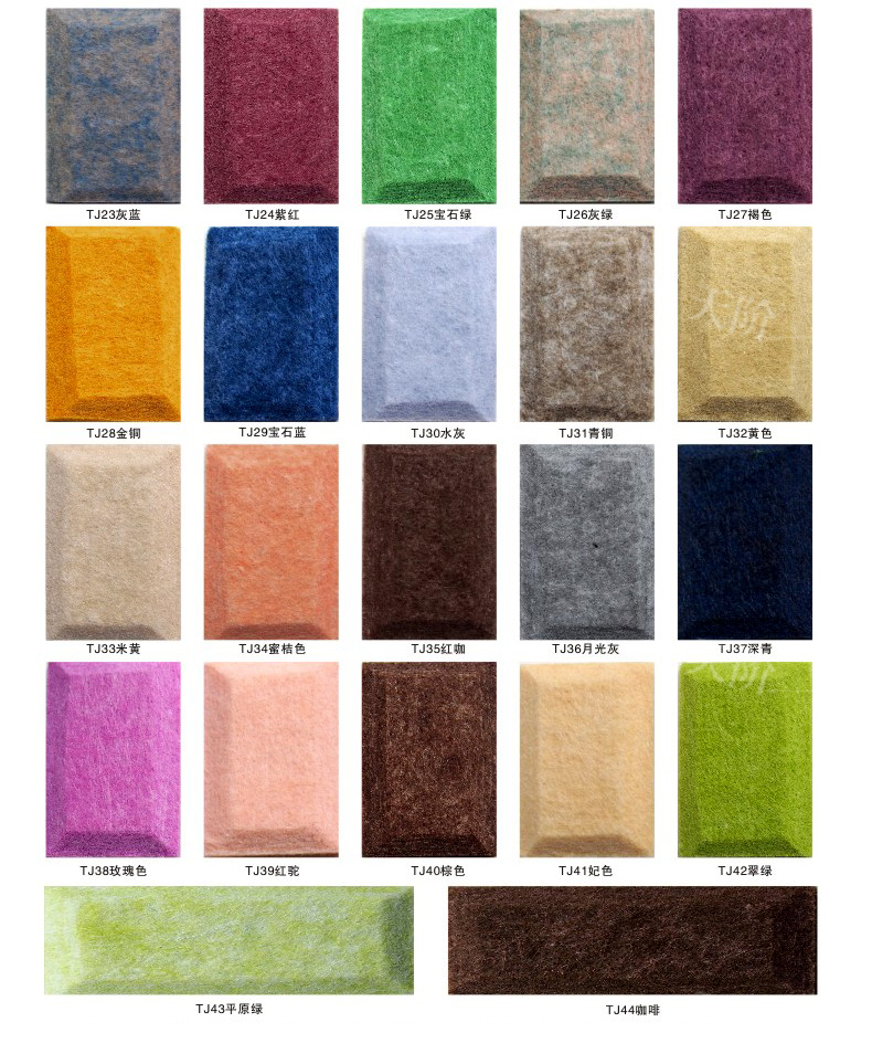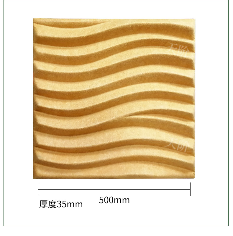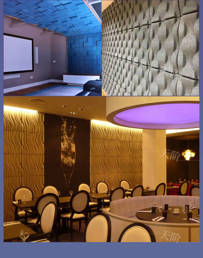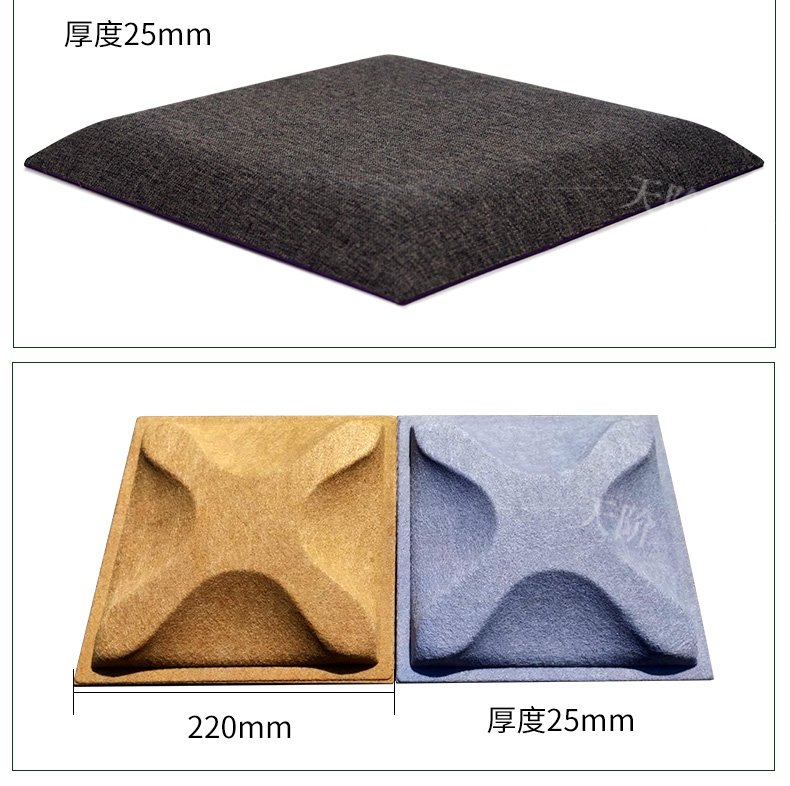 3D聚酯纖維吸音板是今年新研發產品,采用的是綠色環保高新技術熱壓合成繭棉形狀的纖維板材,具有環保,防火,吸音,3D效果裝飾性更立體,易安裝等功能。