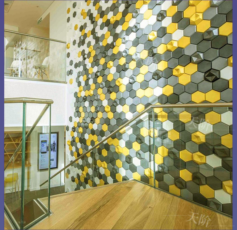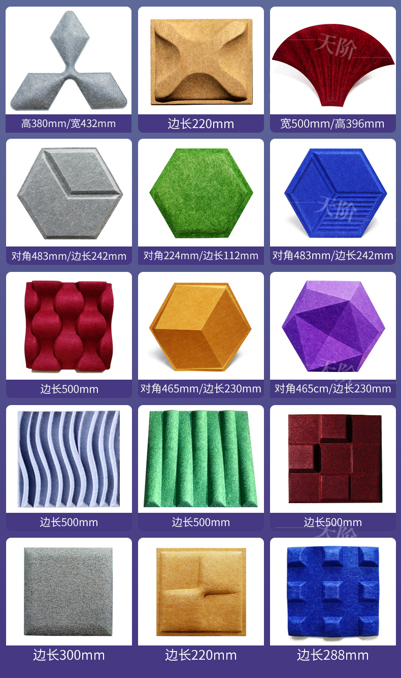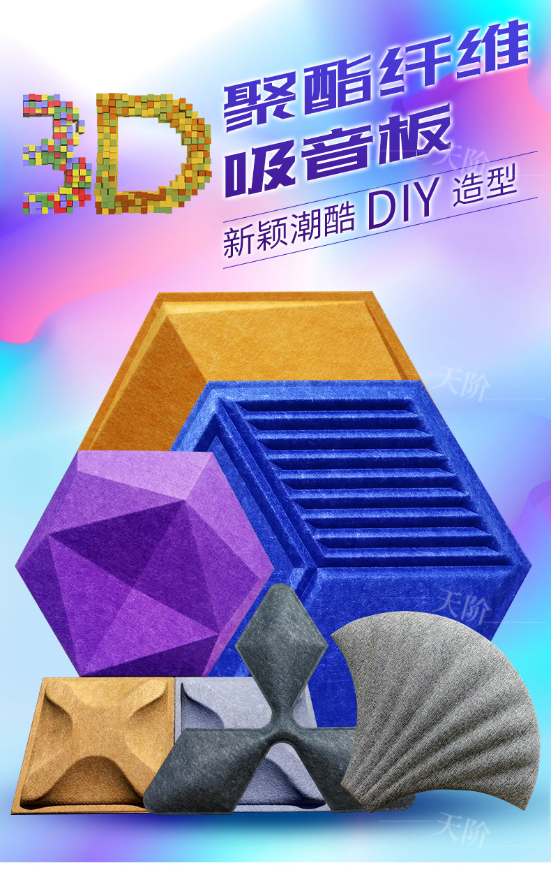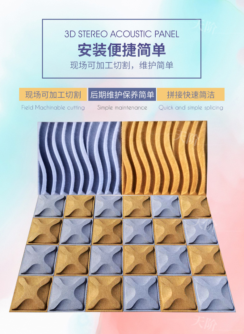 3D聚酯纖維吸音板是今年新研發產品,采用的是綠色環保高新技術熱壓合成繭棉形狀的纖維板材,具有環保,防火,吸音,3D效果裝飾性更立體,易安裝等功能。